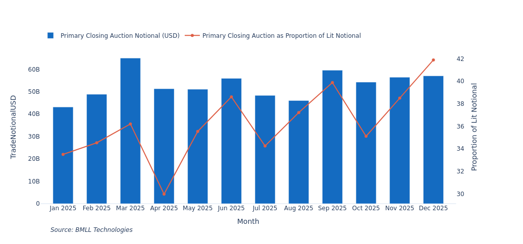 Looking at UK stocks, the total notional traded in the primary closing auction has increased from 43 bn USD in January 2025 to 57 bn USD in December. The dip in share of closing auction trading in April corresponds to the market’s reaction to the US ‘Liberation Day’ tariffs, when trading would have moved intraday. While we use the UK as an example in this article, this analysis could be extended to other countries where we find fragmentation in close liquidity.